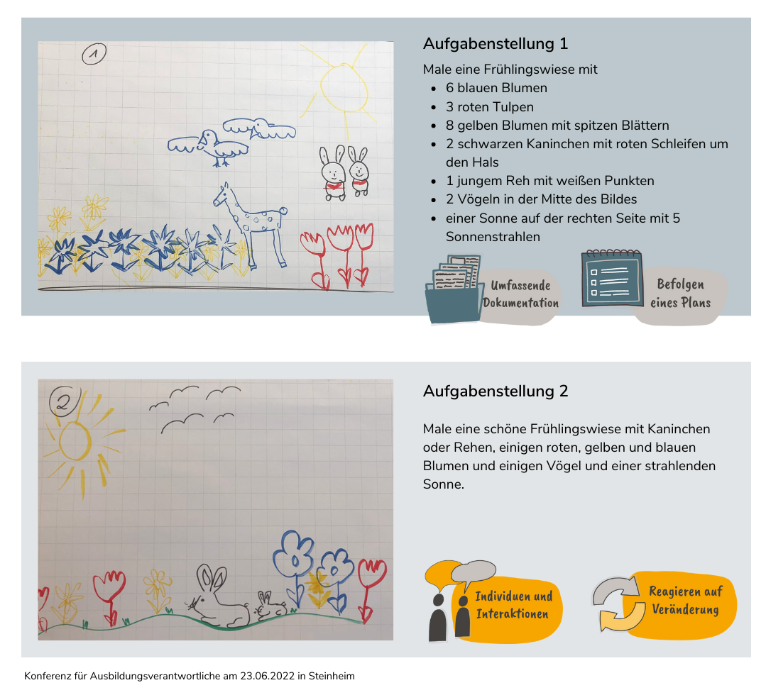 Ausgangspunkt ist das sogenannte agile Manifest und die dahinterliegenden Prinzipien. Die Werte und Prinzipien können unabhängig von der Softwareentwicklung auf andere Bereiche übertragen werden. Zur Veranschaulichung dient folgendes Experiment: Zeichne mit verschiedenen Buntstiften eine Frühlingswiese anhand von zwei unterschiedlichen Aufgabenstellungen.