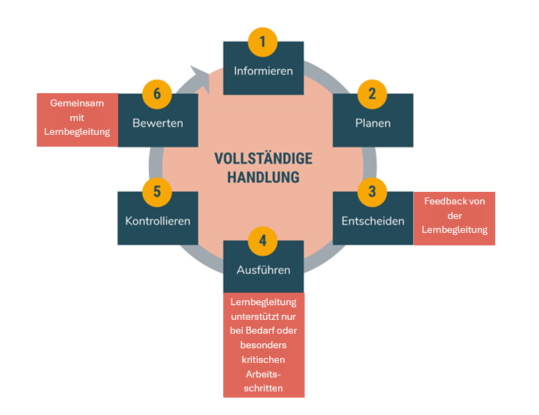 Beim Modell der vollständigen Handlung bearbeiten Auszubildende eine praxisrelevante Lern- oder Projektaufgabe mithilfe von sechs Schritten: Informieren, Planen, Entscheiden, Ausführen, Kontrollieren und Bewerten. Lernbegleiter:innen unterstützen die Azubis über die verschiedenen Phasen des Modells. Durch gezielte Fragen ermutigen sie die Azubis, eigenverantwortlich zu handeln und Entscheidungen zu treffen.