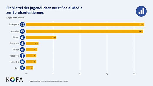 Eine Studie des Kompetenzzentrums Fachkräftesicherung (KOFA) zeigt: Etwa ein Viertel der Jugendlichen verwendet bereits Social Media bei der beruflichen Orientierung. Wie in der der Grafik ersichtlich wird, gehören vor allem Instagram, YouTube und TikTok zu den beliebtesten Plattformen. Diese zeichnen sich insbesondere durch ihren Fokus auf Bilder und Videos aus. Der Vorteil von (audio-)visuellen Formaten liegt darin, dass Bilder oft länger im Gedächtnis bleiben und durch eine persönliche Ansprache eine stärkere emotionale Bindung geschaffen werden kann.