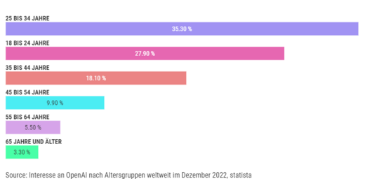 Das größte Interesse an dem KI-Technologieunternehmen OpenAI und dessen Produkten Chat GPT und Dall-E hatte im Dezember 2022 die Altersgruppe der 25- bis 34-Jährigen, wie eine weltweite Analyse der Websitebesucher:innen durch Simliar Web ergab. Der Anteil der noch jüngeren Altersklasse, der 18- bis 24-Jährigen, lag bei rund 28 Prozent. Das Unternehmen erreicht demnach eine junge Zielgruppe. (Quelle: statista)