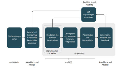 Der KI-Lernfahrplan spricht insbesondere die Praktikerinnen und Praktiker im betrieblichen Kontext an. Er bietet eine leicht verständliche praktische Anleitung, wie KI-gestützte Lernprozesse im Ausbildungssystem implementiert werden können. Der Plan beschreibt eine geordnete Vorgehensweise, bei der ein Lernauftrag zunächst in kleine, einzelne Lernschritte unterteilt wird.