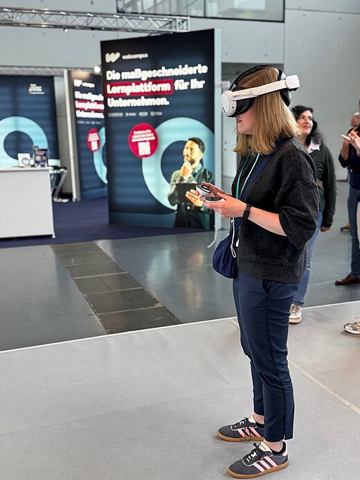 Ein weiteres zentrales Thema war das immersive Lernen mit VR, AR und ersten Anwendungen im Metaverse. Lernen wird dadurch erlebbar – realitätsnah, emotional und interaktiv. So gingen wir mit der VR-Brille auf dem Kopf durch eine Reihenhaussiedlung, auf der Suche nach einem geeigneten Standort für eine Wärmepumpe und lernten z. B. welche Abstandsregelungen bei der Installation eingehalten werden müssen. Oder spielten zur Abwechslung eine Runde Basketball – das war etwas tricky, denn die korrekte Dosierung der Wurfgeschwindigkeit fühlt sich in der VR-Welt anders an als in der Wirklichkeit.