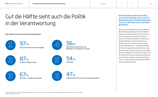 Die TÜV-Studie verdeutlicht, wie wichtig es ist, dass die Politik die Weiterbildung von Ausbilder:innen unterstützt. Unternehmen sind sich ihrer Verantwortung bewusst, benötigen jedoch mehr öffentliche Fördermittel. Die Bundesregierung hat bereits mit ihrer Weiterbildungsstrategie einen wichtigen Anfang gemacht, aber eine schnelle und effektive Umsetzung ist notwendig.