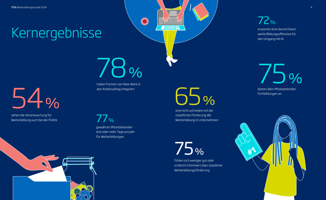 Die TÜV-Weiterbildungsstudie 2024 beleuchtet die aktuellen Trends und Herausforderungen, mit denen deutsche Unternehmen konfrontiert sind: Weiterbildung ist ein entscheidender Faktor, um Innovation und Zukunftsfähigkeit in der Ausbildung voranzutreiben. Dabei spielen spezifische Themen wie digitales Management, kreative Lehransätze und zeitgemäße Trainingsmethoden eine entscheidende Rolle.