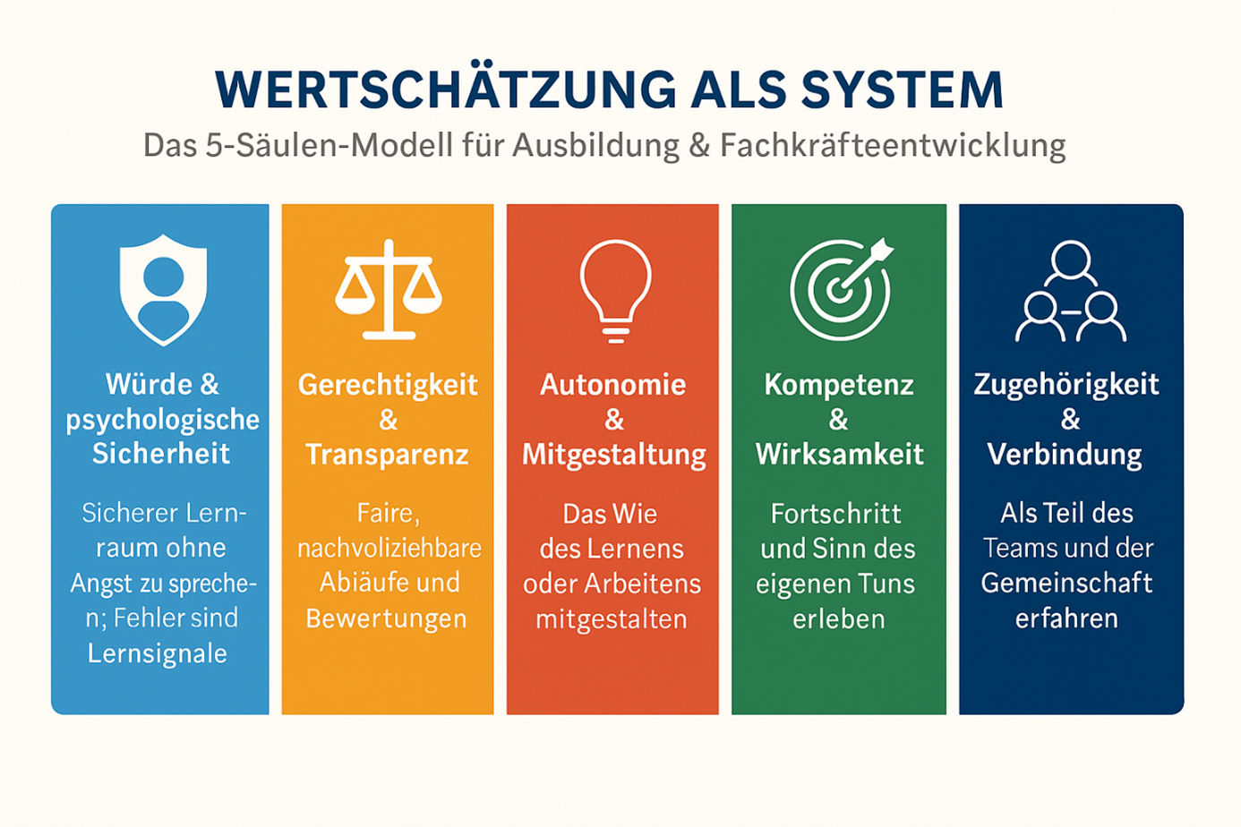 CZ: Wertschätzung wird vor allem als eine Haltung gelebt und kultiviert, dafür braucht es Strukturen. Bei VIAMEA Lead arbeiten wir mit dem 5-Säulen-Modell der Wertschätzung (Grafik) – das zeigt, wie sich Haltung und Struktur verbinden lassen. Zum Beispiel mit der ersten Säule: Würde und Sicherheit. Ein junger Mensch muss spüren dürfen: Ich darf Fehler machen. Ein Ausbilder in einem Handwerksbetrieb macht das wunderbar – er fragt jeden Freitag sein Team: „Was war euer Lernmoment der Woche?“