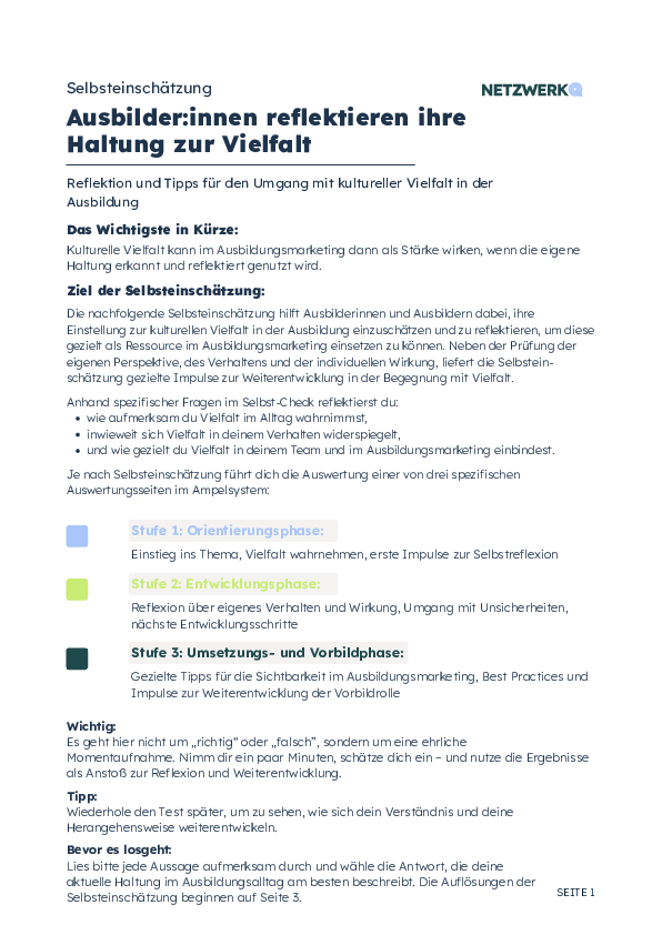 Vielfalt ist mehr als ein Schlagwort – sie beginnt bei der eigenen Haltung. Wie bewusst nimmst du kulturelle Unterschiede im Ausbildungsalltag wahr, und wie nutzt du sie als Stärke? Mit dieser Selbsteinschätzung erhältst du nicht nur Klarheit über deine Perspektive, sondern auch konkrete Impulse, um Vielfalt aktiv und wirkungsvoll in deinem Ausbildungsmarketing einzusetzen. Finde heraus, wo du stehst – und wie du den nächsten Schritt gehst.
