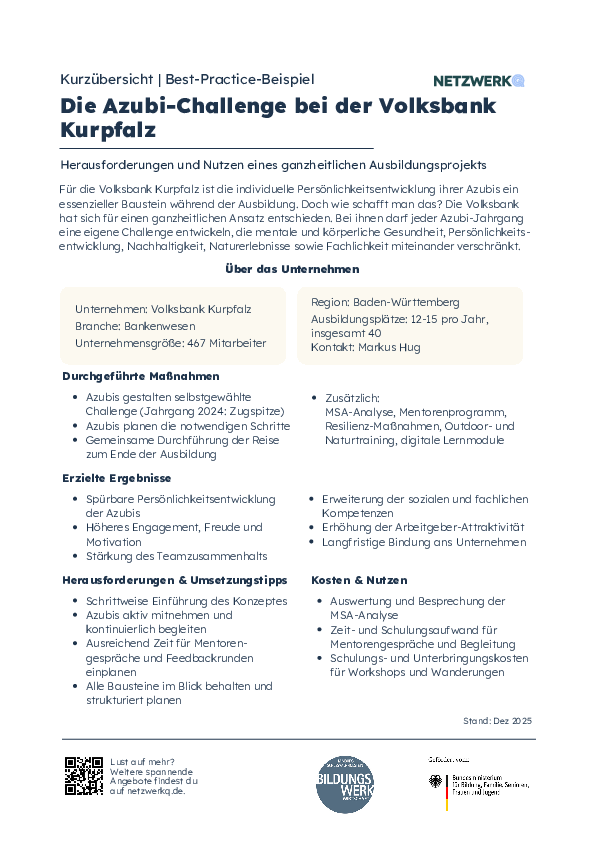 Motivation und das Gefühl, selbstwirksam zu sein, hängen stark zusammen. Die Volksbank Kur-Pfalz hat hierzu ein ganzheitliches Ausbildungsprogramm geschaffen, das persönliche Entwicklung mit den verpflichtenden Lernelementen in der Ausbildung kombiniert. Erfahre in diesem Best Practice, wie es auch dir gelingen kann, ein gewinnbringendes Projekt zu etablieren.