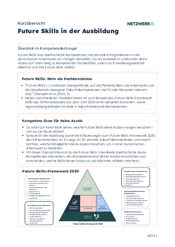 Behalte den Überblick im Kompetenzdschungel! „Future Skills befähigen Menschen, Gesellschaft und Wirtschaft im Wandel souverän, verantwortungsbewusst und gemeinschaftlich mitzugestalten und stärken damit die Innovationskraft der Gesellschaft“ (Gehrs et al., 2025, 4). Du willst auf einen Blick sehen, welche Future Skills deine Azubis morgen brauchen – und wo sie heute stehen? Nutze die Kurzübersicht zum Future-Skills-Framework 2030 des Stifterverbands. Es zeigt dir branchen- und regionsübergreifend die 30 zentralen Zukunftskompetenzen und macht sichtbar, welche Fähigkeiten deine Azubis brauchen, um in einer dynamischen, wandlungsgetrieben Arbeitswelt zu bestehen. Mit Hilfe der Übersicht kannst du die Future Skills in konkrete überfachliche Azubi-Kompetenzen übersetzen, den Kompetenzstand deiner Azubis einschätzen und entscheiden, welche Skills deiner Azubis du als Nächstes stärken möchtest.