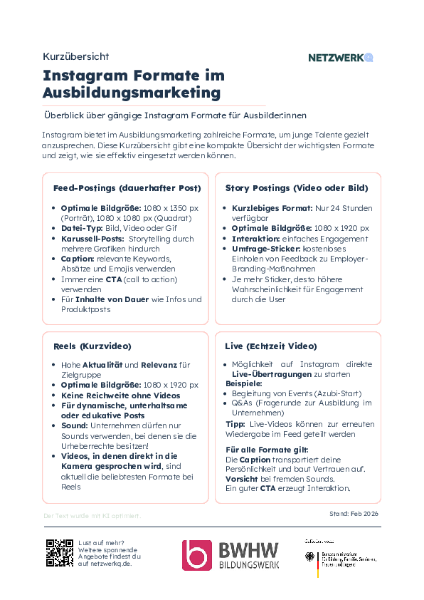 Instagram ist ein zentraler Kanal im Ausbildungsmarketing. Diese Kurzübersicht zeigt Ausbilder:innen, wie Feed-Posts, Stories, Reels und Liveformate gezielt eingesetzt werden, um junge Talente anzusprechen.