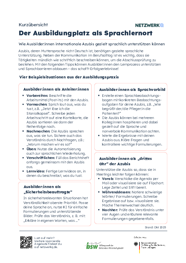 Azubis, deren Muttersprache nicht Deutsch ist, benötigen gezielte sprachliche Unterstützung. Neben der Kommunikation im Berufsalltag ist es wichtig, dass sie Tätigkeiten mündlich wie schriftlich beschreiben können, um die Abschlussprüfung zu bestehen. Mit den folgenden Tipps können Ausbilder:innen den Lernprozess unterstützen und Sprachbarrieren abbauen – das schafft Erfolgserlebnisse!