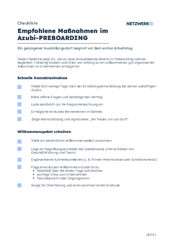 Diese Checkliste zeigt dir, wie du neue Auszubildende bereits im Preboarding optimal begleitest, frühzeitig bindest und ihnen von Anfang an ein willkommenes, gut organisiertes Ankommen im Unternehmen ermöglichst.