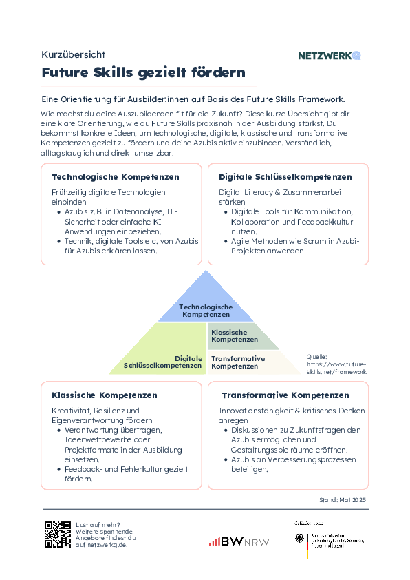 Wie machst du deine Auszubildenden fit für die Zukunft? Diese kurze Übersicht gibt dir eine klare Orientierung, wie du Future Skills praxisnah in der Ausbildung stärkst. Du bekommst konkrete Ideen, um technologische, digitale, klassische und transformative Kompetenzen gezielt zu fördern und deine Azubis aktiv einzubinden. Verständlich, alltagstauglich und direkt umsetzbar.