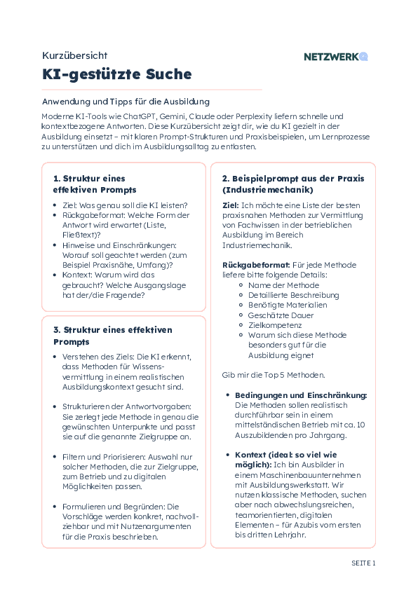 Moderne KI-Tools wie ChatGPT, Gemini, Claude oder Perplexity liefern schnelle und kontextbezogene Antworten. Diese Kurzübersicht zeigt dir, wie du KI gezielt in der Ausbildung einsetzt – mit klaren Prompt-Strukturen und Praxisbeispielen, um Lernprozesse zu unterstützen und dich im Ausbildungsalltag zu entlasten.