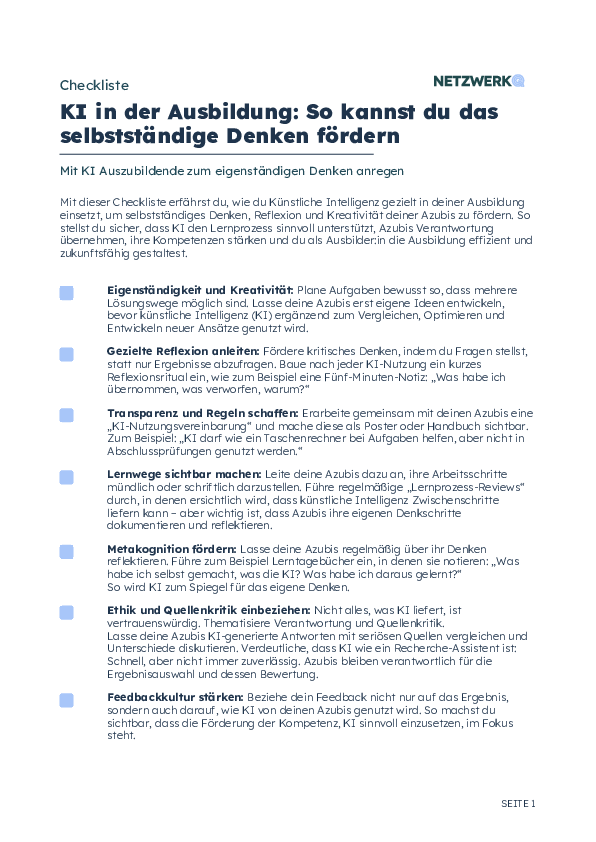 Mit dieser Checkliste erfährst du, wie du Künstliche Intelligenz gezielt in deiner Ausbildung einsetzt, um selbstständiges Denken, Reflexion und Kreativität deiner Azubis zu fördern. So stellst du sicher, dass KI den Lernprozess sinnvoll unterstützt, Azubis Verantwortung übernehmen, ihre Kompetenzen stärken und du als Ausbilder:in die Ausbildung effizient und zukunftsfähig gestaltest.