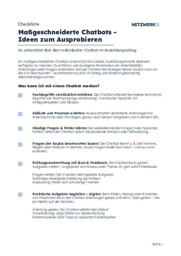 Ein maßgeschneiderter Chatbot unterstützt dich dabei, Ausbildungsinhalte jederzeit verfügbar zu machen. Du erfährst, wie du eigene Materialien wie Arbeitsblätter, Anleitungen oder Fragen einbindest und der Chatbot die Anliegen deiner Azubis rund um die Uhr beantwortet – so entlastest du dich im Alltag und förderst gleichzeitig selbstständiges Lernen.