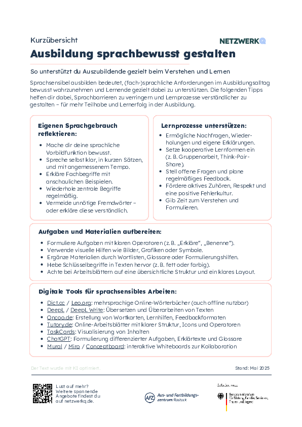 Sprachsensibel ausbilden bedeutet, (fach-)sprachliche Anforderungen im Ausbildungsalltag bewusst wahrzunehmen und Lernende gezielt dabei zu unterstützen. Die folgenden Tipps helfen dir dabei, Sprachbarrieren zu verringern und Lernprozesse verständlicher zu gestalten – für mehr Teilhabe und Lernerfolg in der Ausbildung.