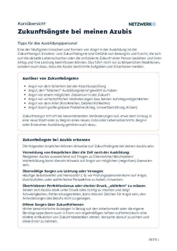 Eine der häufigsten Ursachen und Formen von Angst in der Ausbildung ist die Zukunftsangst. Existenz- und Zukunftsängste sind Gefühle von Besorgnis und Furcht, die sich auf die aktuelle Lebenssituation oder die antizipierte Zukunft einer Person beziehen und ihren Alltag und ihre Leistung beeinflussen können. Das führt nicht nur zu körperlichen Reaktionen, sondern auch dazu, dass die Azubis bestimmte Aufgaben und Situationen meiden.
