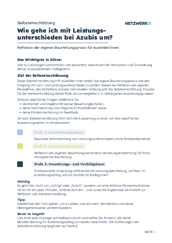 Wie gehe ich mit unterschiedlichen Leistungsniveaus bei Azubis um? Reflektiere dein eigenes Vorgehen kritisch, um mögliche blinde Flecken zu erkennen und praxisnahe Hinweise für die Umsetzung im Ausbildungsalltag zu bekommen. So kannst du Lernprozesse situationsgerechter unterstützen, Potenziale gezielt fördern und Entscheidungen fair und nachvollziehbar treffen.